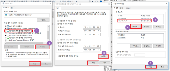 이더넷 -> 마우스 오른쪽 버튼 -> 속성 -> 고급 -> 가상 머신의 ip 주소대역대를 추가한다.