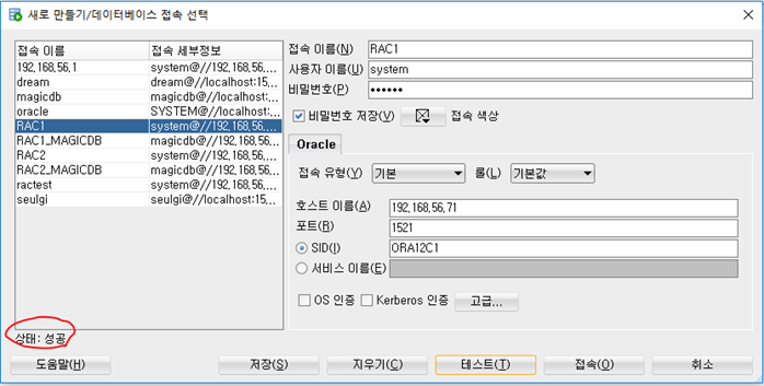 system으로 접속할 것이고 본인이 설정한 system 비밀번호를 입력하면 된다. 호스트 이름에는 호스트 이름을 적거나 ip주소를 적으면 되는데 보통은 주소가 하나여서 가상머신 ip주소 하나를 입력하면 되지만 rac 같은경우는 ip주소가 여러 개다. 외부에서 접속할 때는 public으로 설정한 주소를 입력하면 된다. 그 후 오라클 포트 번호인 1521 (변경하지 않았다면)를 적고 SID를 적으면 된다.