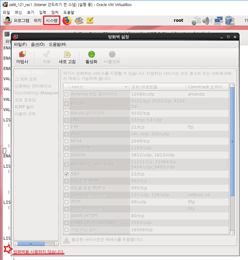 시스템 -> 관리 -> 방화벽 -> 비활성화 -> 적용