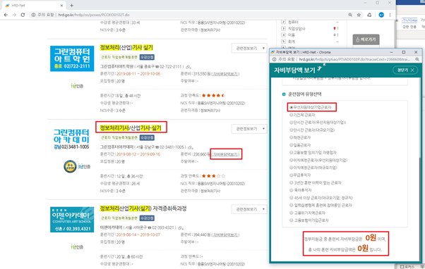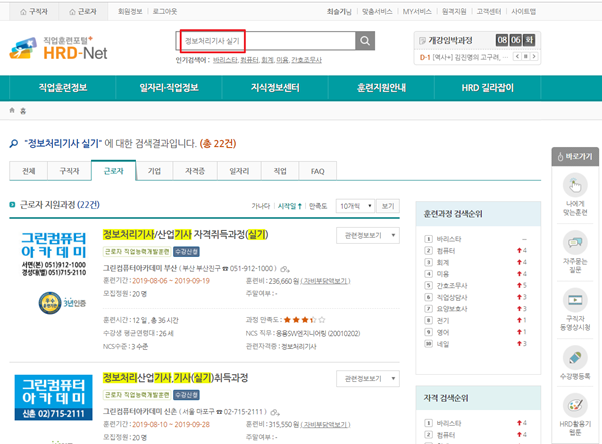 내일배움카드로는 무엇을 들을까 고민을 많이했습니다. 원래는 직업이 컴퓨터쪽이다 보니 컴퓨터 관련 특강보다 다른 것도 배워보고 싶었지만 컴퓨터 실력이 많이 부족해서 컴퓨터 특강을 신청하게 되었습니다! 즐거운 마음으로 컴퓨터 관련 특강을 듣도록 하겠습니다.ㅎㅎㅎ 정보처리기사 필기는 합격했는데 실기를 아직 시험을 보지 못했습니다. 필기를 합격하고 난 후 실기 공부를 회사 끝나고 하려고했는데 생각보다 잘안하게 되서 정보처리기사 학원을 등록하게 되었습니다 ㅠ