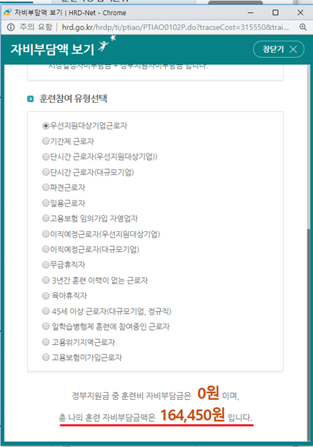 즉 총 강의가 30만원이라고 하면 135,550원은 국가에서 내일배움카드로 지원을 해주는 것이고 164,450원은 내가 부담해야하는 돈입니다.