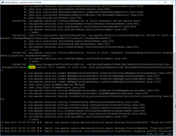 에러 로그를 살펴보니 Major.minor version 52.0 이런 에러가 뜨는데, 자바 버전이 안 맞아서 뜰 확률이 높다고 한다.
