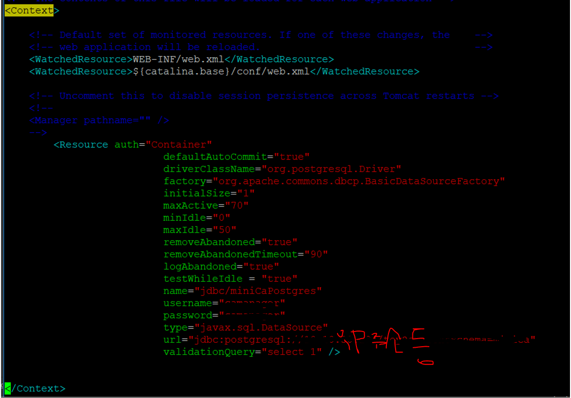 <Resource auth="Container" defaultAutoCommit="true" driverClassName="org.postgresql.Driver" factory="org.apache.commons.dbcp.BasicDataSourceFactory" initialSize="1" maxActive="70" minIdle="0" maxIdle="50" removeAbandoned="true" removeAbandonedTimeout="90" logAbandoned="true" testWhileIdle = "true" name="jdbc/miniCaPostgres" username="username" password="password" type="javax.sql.DataSource" url="jdbc:postgresql://11.11.11.1111/111?currentSchema=11111" validationQuery="select 1" /> </Context> |
