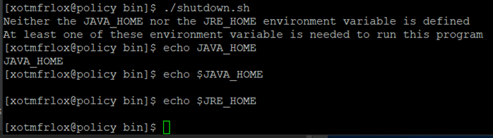 JAVA_HOME과 JRE_HOME을 못찾아서 생기는 에러 같아서 echo로 출력해보니 역시 찾지를 못한다.