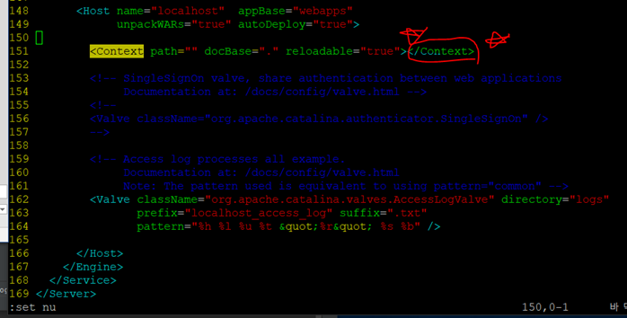 Webapp 자체를 웹 루트 디렉토리로 만들고 싶을 때 <Host name … 아래에 <Context path=””…를 추가한다.