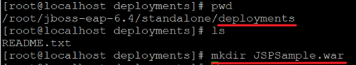 Jboss의 deployments로 이동한 후 JSPSample.war 디렉토리를 생성합니다. 반드시 *.war로 끝나야 인식이 됩니다.
