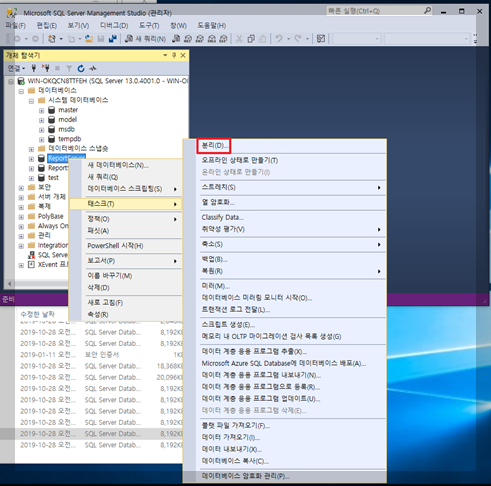 기존에 window에서 mysql(mariadb) data 폴더 변경을 할 때는 서버를 내리고 하기 때문에 복사 붙여넣기로 옮길 수 있었다. 하지만 mssql에는 서버를 내리지 않고 DB를 옮겨야 하기 때문에 연결을 먼저 분리해준 후 다시 연결해줘야 한다는 차이점이 있다.
