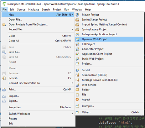 저는 툴은 sts를 사용하고 dynamic web porject를 만들도록 하겠습니다. 프로젝트 명은 ajax2로 하겠습니다.