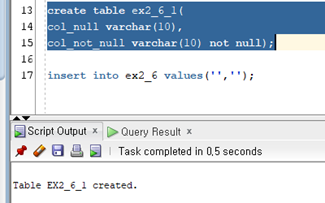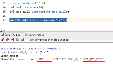 NULL: 값이 없음을 의미한다. NULL 허용이란 해당 컬럼에 값을 넣지 않아도 된다는 의미이며, NOT NULL로 명시한 컬럼에 데이터를 넣지 않으면 INSERT가 불가능하다.