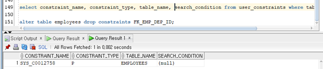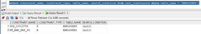 select constraint_name, constraint_type, table_name, search_condition from user_constraints where table_name = 'EMPLOYEES';