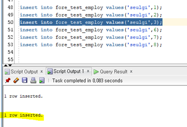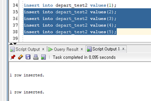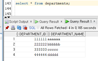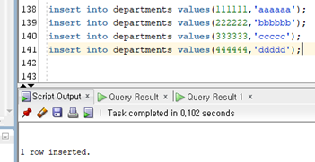 insert into departments values(111111,'aaaaaa'); insert into departments values(222222,'bbbbbb'); insert into departments values(333333,'ccccc'); insert into departments values(444444,'ddddd'); |