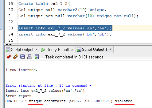 컬럼명 데이터타입 UNIQUE 혹은 CONSTRAINTS 제약조건명 UNIQUE(컬럼명, …)