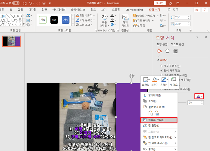 도형 서식을 이용하여 네모박스 색깔을 보라색으로 변경하고 마우스 오른쪽 버튼의 텍스트 편집을 이용하여 텍스트를 입력함.