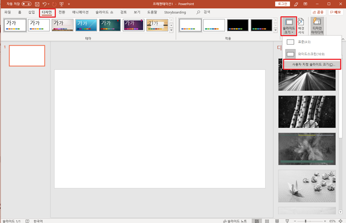 2) 상단 메뉴에서 디자인 -> 슬라이드 크기 -> 사용자 지정 슬라이드 크기 클릭