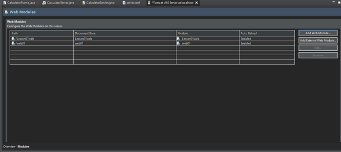 서버 더블 클릭 -> Moldules -> Add Web Module… 버튼 클릭하여 웹 모듈 등록창을 띄운다.