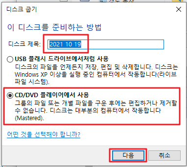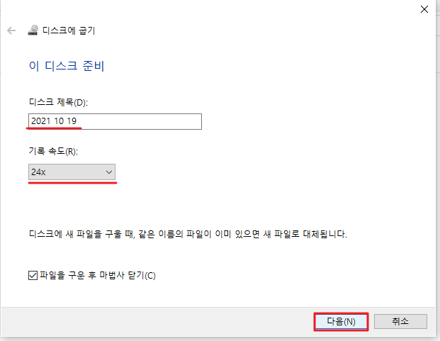 디스크의 제목은 원하시는걸로 바꿔주시고, 기록속도는 24x가 제일 빠른것 같은데 더 느르게 바꾸실분이 느리게 바꾸셔도 됩니다. 그 후 다음을 눌러주세요.