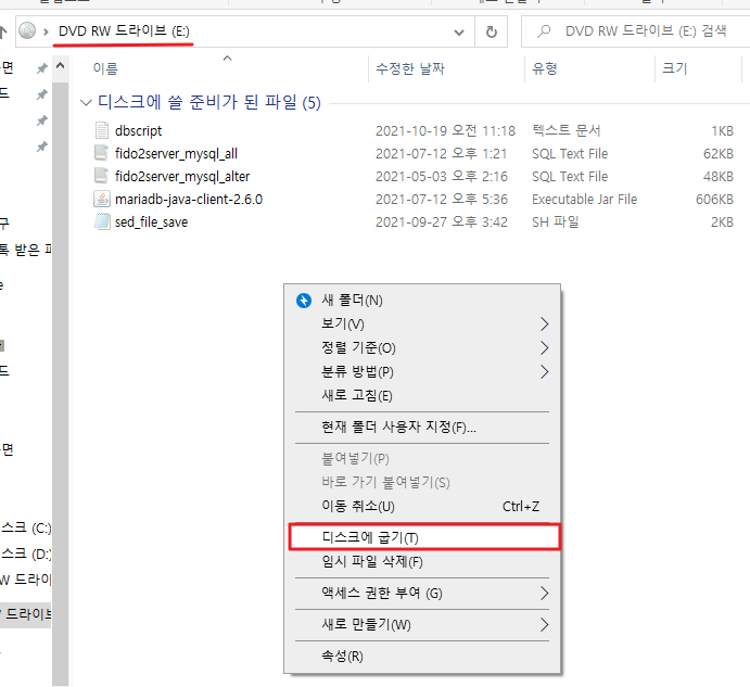 마우스 오른쪽 버튼을 클릭한후 디스크에 굽기를 눌러줍니다.