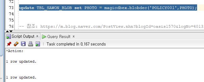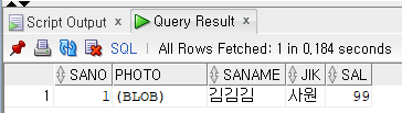 -- tbl_sawon_blob 테이블이 잘 생성되었는지 확인 select * from tbl_sawon_blob; |