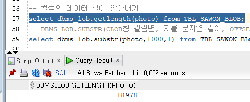 - DBMS_LOB.GETLENGTH(컬럼명)