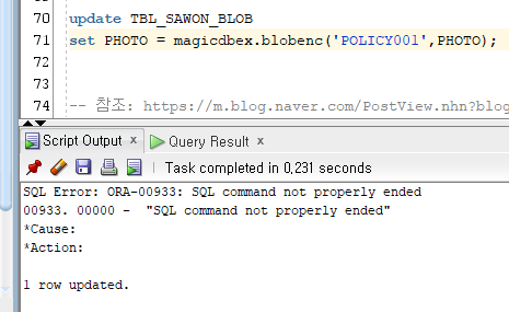 DBMS_LOB.OPEN(V_SOURCE_BFILE, DBMS_LOB.LOB_READONLY ); DBMS_LOB.LOADBLOBFROMFILE ( V_LOCATOR ,V_SOURCE_BFILE ,DBMS_LOB.GETLENGTH(V_SOURCE_BFILE) ,V_DEST_OFFSET ,V_SRC_OFFSET ); DBMS_LOB.CLOSE(V_SOURCE_BFILE); COMMIT; DBMS_OUTPUT.PUT_LINE('BLOB 타입의 테이터 저장 성공'); EXCEPTION WHEN OTHERS THEN DBMS_OUTPUT.PUT_LINE('BLOB 타입의 테이터 저장 실패'); END;