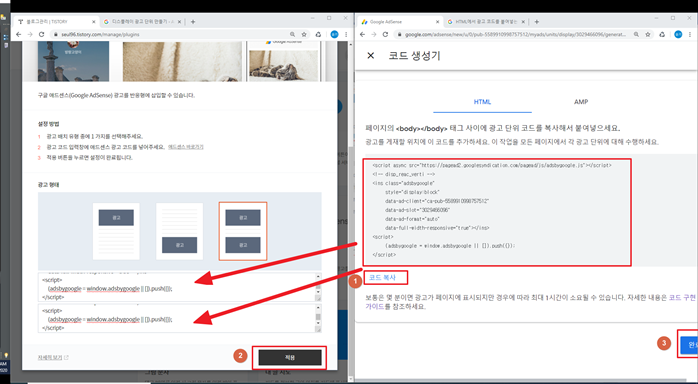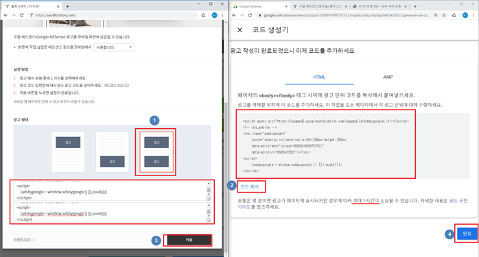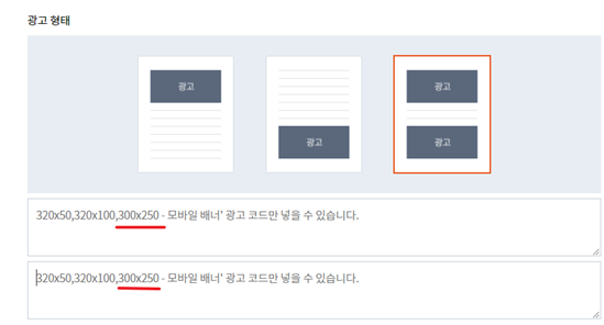 저는 위 아래 다 넣겠다고 선택을 하고 320x50과 320x100과 300x250중에 가장 큰 300x250 광고 코드를 넣도록 하겠습니다!