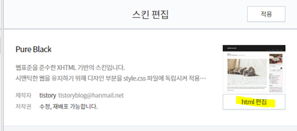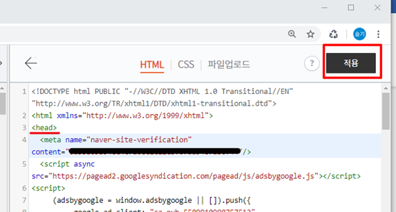 <head> 바로 아래에 코드 삽입 후 적용 클릭
