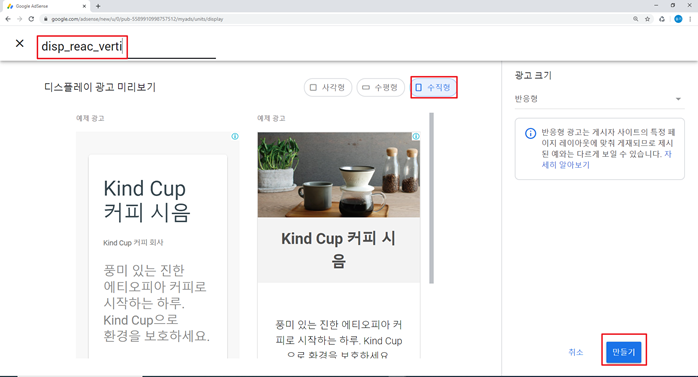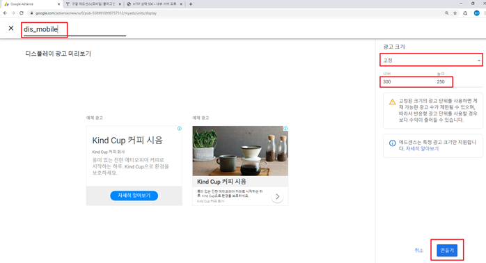 이름은 아무거나 입력하시고 광고 크기를 고정으로 바꾼 다음에 320x50과 320x100과 300x250중에 본인이 원하는 너비와 높이를 입력하시고 만들기를 누르시면 됩니당 ^0^ 쉽지용