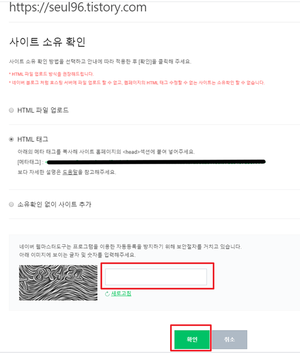 HTML 태그를 선택하면 아래의 메타 태그를 복사해 사이트 홈페이지의 <head>섹션에 붙여달라고 되어있네요.