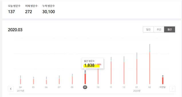 그렇다면 방문자 수가 가장 높았던 20년 2월에는 5315명이 들어왔고 매일 꾸준히 200명이 좀 안되는 183명이 들어왔다는 의미가 됩니다.