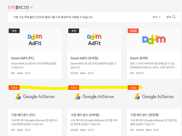 블로그의 플러그인을 들어가면 구글 애드센스(PC), 구글 애드센스(모바일), 구글 애드센스(반은형)이 알맞게 사용중이라고 뜹니다.