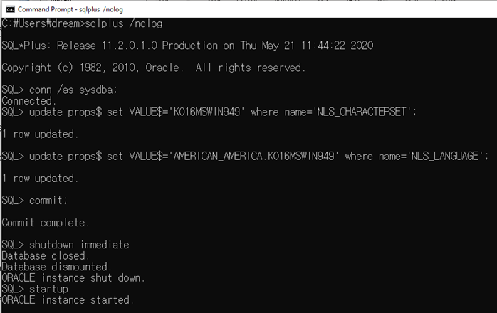update props$ set VALUE$='KO16MSWIN949' where name='NLS_CHARACTERSET';