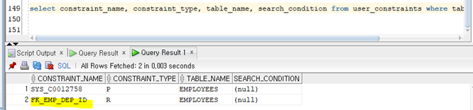 select constraint_name, constraint_type, table_name, search_condition from user_constraints where table_name = 'EMPLOYEES';