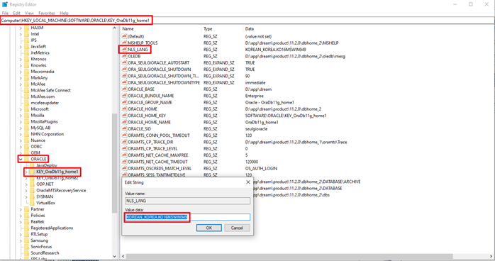 KOREAN_KOREA.KO16MSWIN949로 값을 변경한 후 레지스트리편집기를 종료