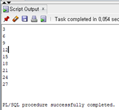 | declare a number := 3; b number := 1; begin while b<=9 loop dbms_output.put_line(a*b); b:=b+1; end loop; end; |
