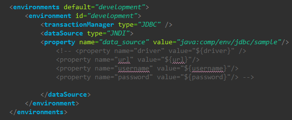 <environments default="development"> <environment id="development"> <transactionManager type="JDBC" /> <dataSource type="JNDI"> <property name="data_source" value="java:comp/env/jdbc/sample"/> <!-- <property name="driver" value="${driver}" /> <property name="url" value="${url}"/> <property name="username" value="${username}"/> <property name="password" value="${password}"/> -->