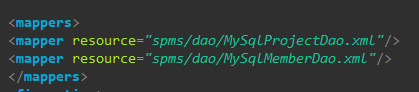 <mappers> <mapper resource="spms/dao/MySqlProjectDao.xml"/> <mapper resource="spms/dao/MySqlMemberDao.xml"/> </mappers> </configuration> |