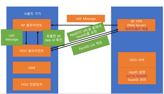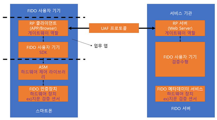 RP 응용 서버 – FIDO 클라이언트 간에는 UAF 프로토콜인 조회(Discovery), 등록(Registration), 인증(Authentication), 거래 확인(Transaction Confirmation), 해지(Deregistaion) 기능 처리