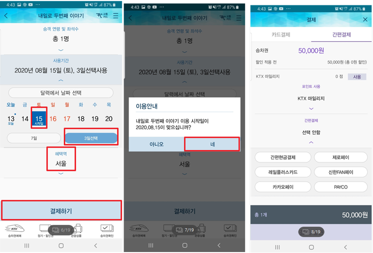 저는 8월 15일 토요일에 기차를 탑승해야 하기 때문에 8월 15일 토요일로 선택.
