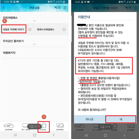신분증을 꼭 지참, KTX 총 2회(1일 1회), 일반열차 1일 2회까지 좌석지정이 가능, 반환 및 변경은 1일전까지 가능 하다라는 글이 적혀있습니다
