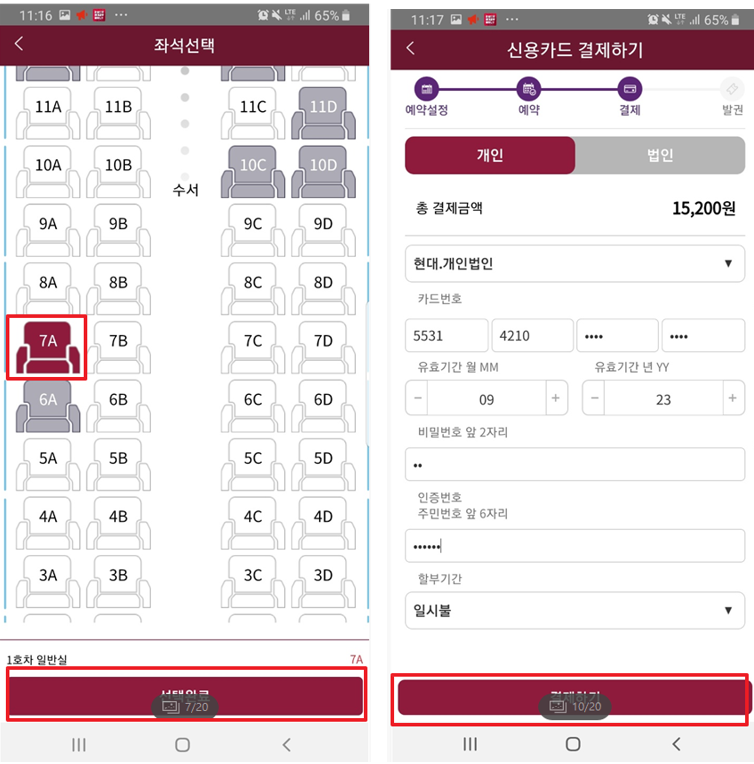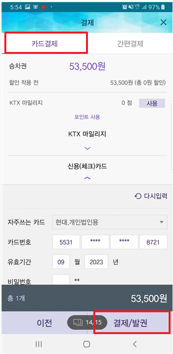 5) 카드 결제 선택하면 등록한 카드가 뜬다. 결제 선택