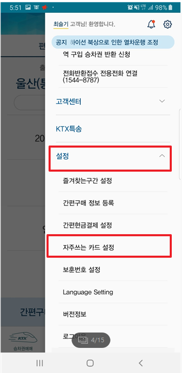 1) 메뉴 -> 설정 -> 자주쓰는 신용카드 설정