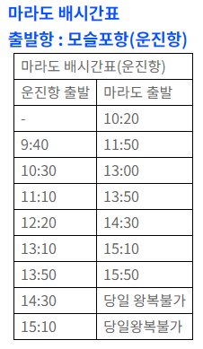 저는 10시 30분에 운진항에서 마라도로 출발하는 것을 예매했는데, 10시 30분꺼를 구매하면 말도에서 13시에 돌아오는 거를 타야한다고 하시더라구요~ 근데 저는 마라도에 오래있고 싶어서 배 시간 조정이 안되냐고 여쭤봤어요! 그랬더니 그건 예약인원에 따라 안 될수도 있다고 원래 탑승시간 1시간전쯤인가 2시간전쯤인가 다시 표에 적힌 번호로 전화해서 출발시간 바꿀 수 있는지 다시 여쭤보라고 했습니다! 그래서 전화로 바꾸는 것을 성공했고 13:00 배가 아닌 14:30 배로 바꿀 수 있었습니다~