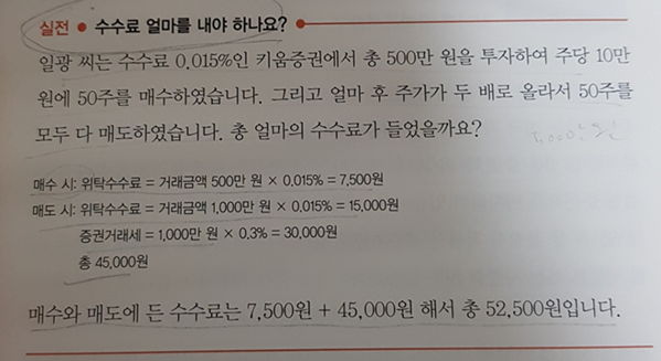 500만원 투자하여 주당 10만원 50주 매수. 그 후 주가가 두배로 올라서 50주 모두다 매도. 총 얼마의 수수료가 들까? 단 키움증권을 사용하여 수수료 0.015%라고 가정.