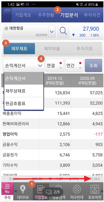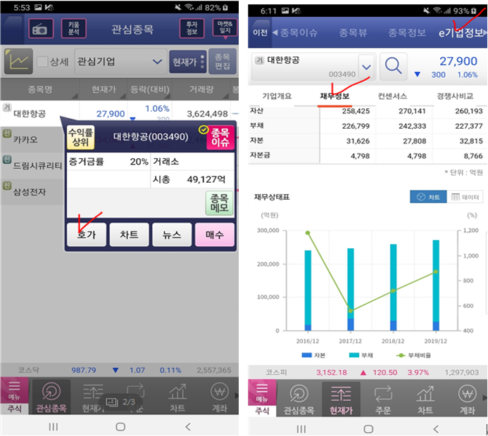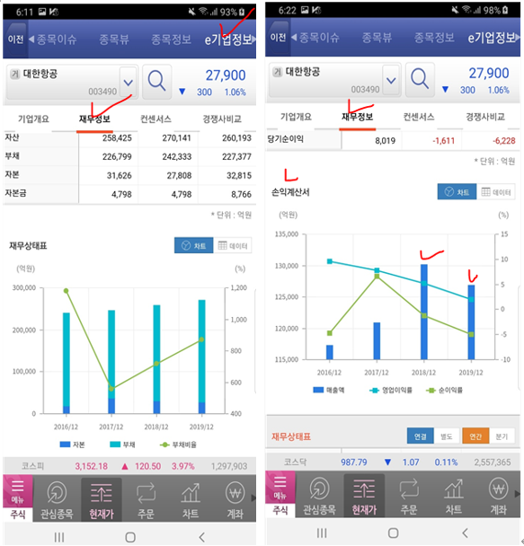 영웅문S APP 접속 -> 확인하고 싶은 기업 클릭 -> e기업정보 -> 재무정보