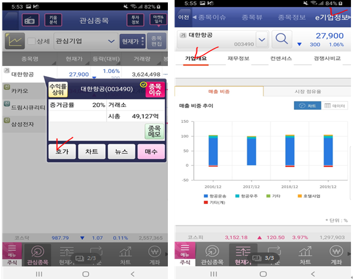 영웅문S APP 접속 -> 확인하고 싶은 기업 클릭 -> e기업정보 -> 매출 비중