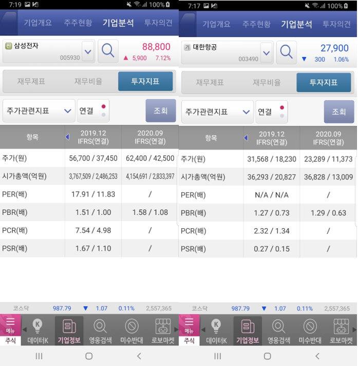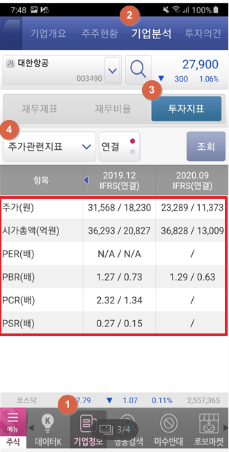 투자지표는 재무비율과 함께 투자를 할 떄 반드시 챙겨 봐야하는 항목들이다. 여기에는 PER, PBR과 같은 주가 관련지표, 기업가치 지표들이 수록되어있다.