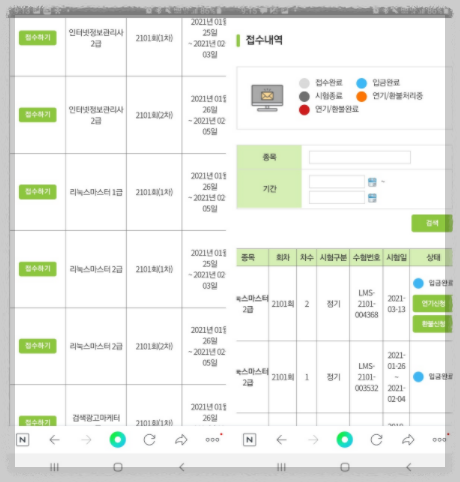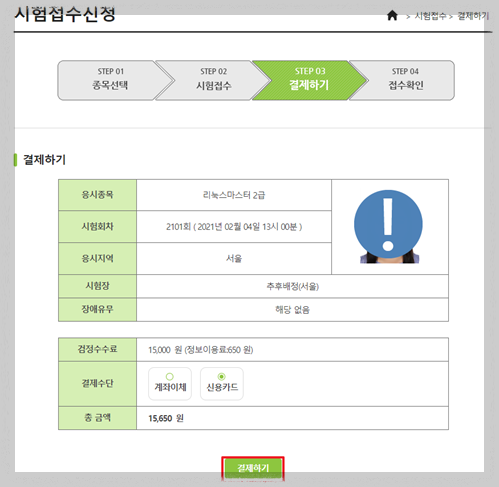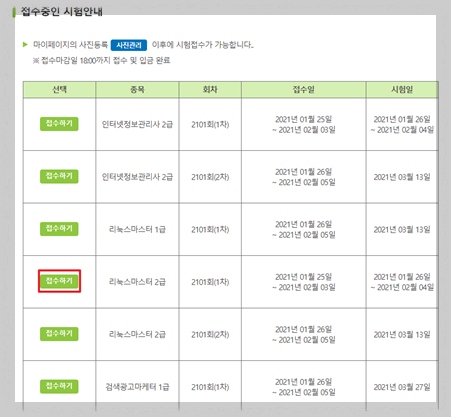 로그인 -> 시험접수 -> 접수 신청 -> 리눅스 마스터 2급 2차 접수하기 클릭 -> 결제 진행 -> 접수내역 확인