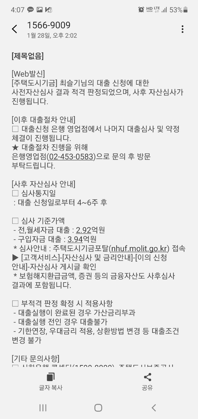 신청후에는 이제 자산심사에 들어가요 2일 후면 아래와 문자로 우선 사전 자산심사에 적격이라고 옵니다.