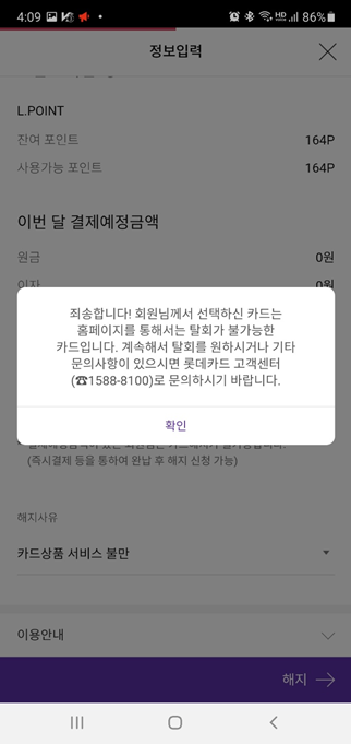 앗 사용안하던 체크카드는 여기까지 하면 해지가 잘 되었는데 신용카드는 홈페이지 통해서 탈회가 불가능한 카드라고 전화해달라고 뜨네요