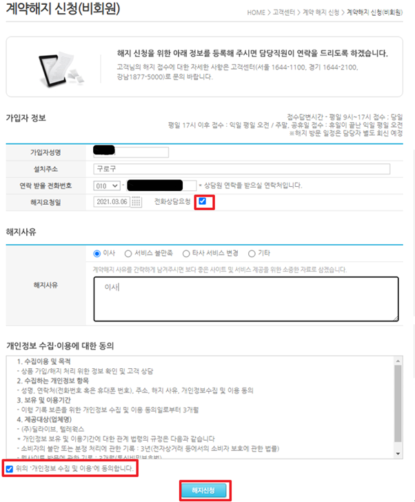 저렇게 인터넷에서 해지 신청을 하고 전화상담요청을 했습니다! 2시간후쯤 전화가 왔는데